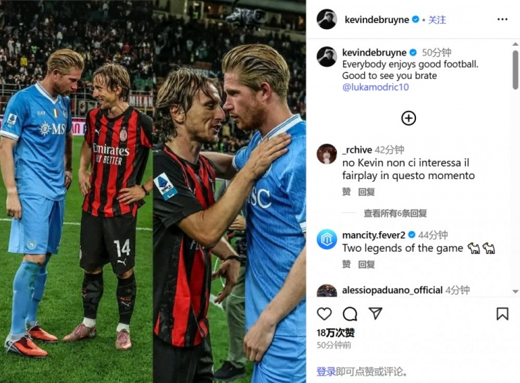 9月29日讯 在对阵AC米兰的赛事 后,那不勒斯中场球员德布劳内在社交媒体上传了与莫德里奇的合影。